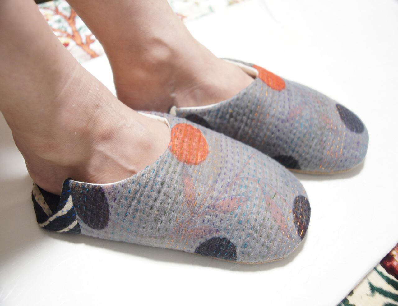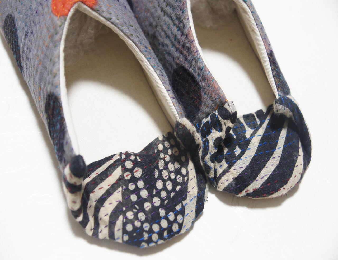 ミエコミンツ オリジナルカンタ(インドの刺し子)のスリッパです。カンタ素材独特の柔らかさ、暖かさに加えて、少しゆったり目のサイズですので素足にとても心地よいです。左右のデザインは微妙に変えてあります。